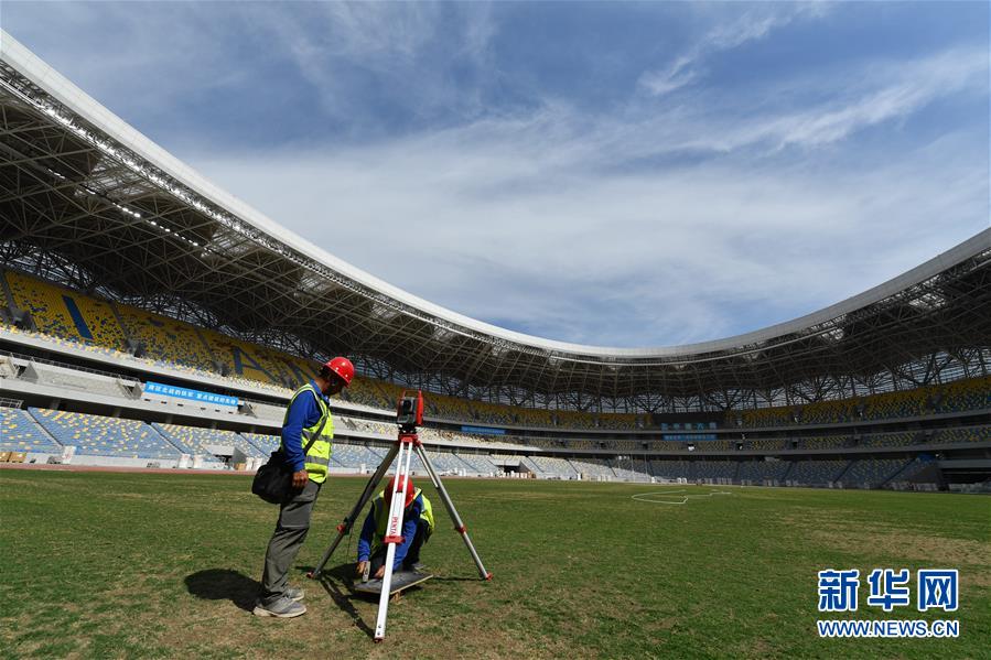 5月29日,工人在西安奧體中心體育場(chǎng)進(jìn)行場(chǎng)地測(cè)量。新華社記者張博文攝