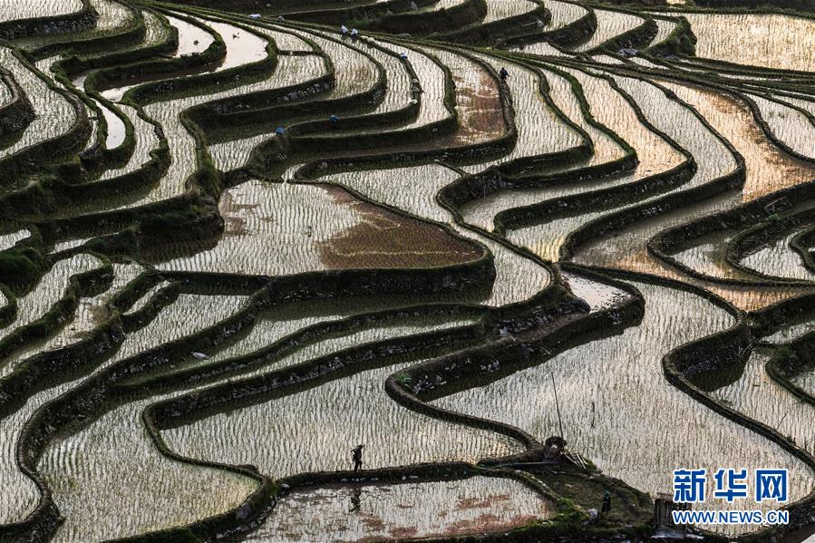 晨光中的從江縣加榜鄉(xiāng)加車梯田(5月27日攝)。夏日時(shí)節(jié),位于貴州省黔東南苗族侗族自治州從江縣加榜鄉(xiāng)加車、加頁(yè)、黨扭等苗寨的梯田在晨霧與陽(yáng)光的映襯下線條分明,光影變幻,景色如畫。新華社記者 楊文斌 攝