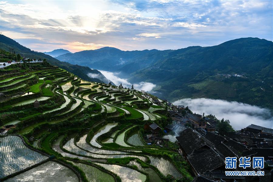 晨光中的從江縣加榜鄉(xiāng)加車梯田(5月28日攝)。夏日時(shí)節(jié),位于貴州省黔東南苗族侗族自治州從江縣加榜鄉(xiāng)加車、加頁(yè)、黨扭等苗寨的梯田在晨霧與陽(yáng)光的映襯下線條分明,光影變幻,景色如畫。新華社記者 楊文斌 攝