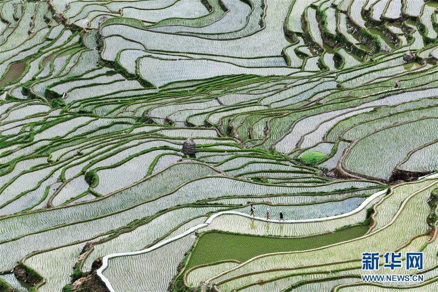 村民從從江縣加榜鄉(xiāng)黨扭梯田上經(jīng)過(guò)(5月26日攝)。夏日時(shí)節(jié),位于貴州省黔東南苗族侗族自治州從江縣加榜鄉(xiāng)加車、加頁(yè)、黨扭等苗寨的梯田在晨霧與陽(yáng)光的映襯下線條分明,光影變幻,景色如畫。新華社記者 楊文斌 攝
