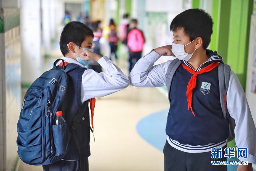 貴州貴陽,小學(xué)復(fù)課,兩名學(xué)生用“碰肘”的方式打招呼(5月25日攝)。新華社記者劉續(xù)攝