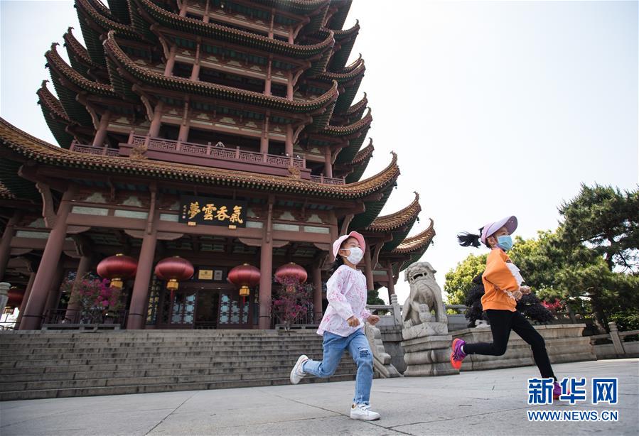 武漢黃鶴樓,兒童在重新開放的黃鶴樓景區(qū)奔跑(4月29日攝)。新華社記者肖藝九攝