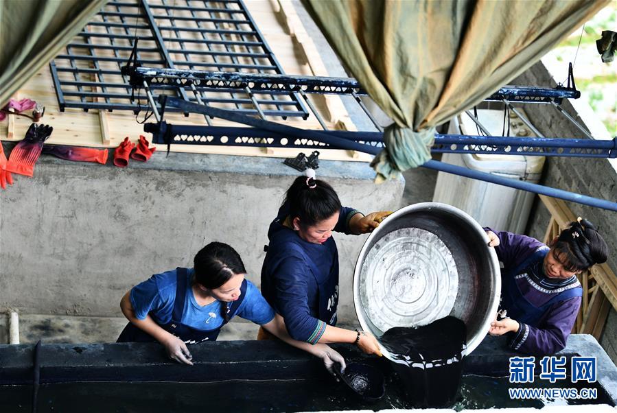 2018年,楊成蘭在村里成立傳統(tǒng)織染合作社,吸引村里及周邊村寨貧困戶入股,帶動當(dāng)?shù)刎毨艉痛迕窦尤牒献魃纾瑥氖驴棽?、染布、藍(lán)靛種植等產(chǎn)業(yè),在傳承民族傳統(tǒng)手工技藝的同時,幫助村民脫貧增收。新華社記者楊文斌攝