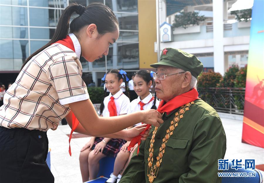 5月29日,少先隊(duì)員給李延年戴上紅領(lǐng)巾?!傲弧眹?guó)際兒童節(jié)來臨之際,“共和國(guó)勛章”獲得者、老一輩戰(zhàn)斗英雄李延年來到廣西南寧市濱湖路小學(xué)給孩子們講述戰(zhàn)爭(zhēng)年代的紅色故事,寄語他們好好學(xué)習(xí)、努力奮斗。孩子們向李延年贈(zèng)送了師生共繪的“紅色畫卷”,向老英雄致敬。新華社記者周華攝