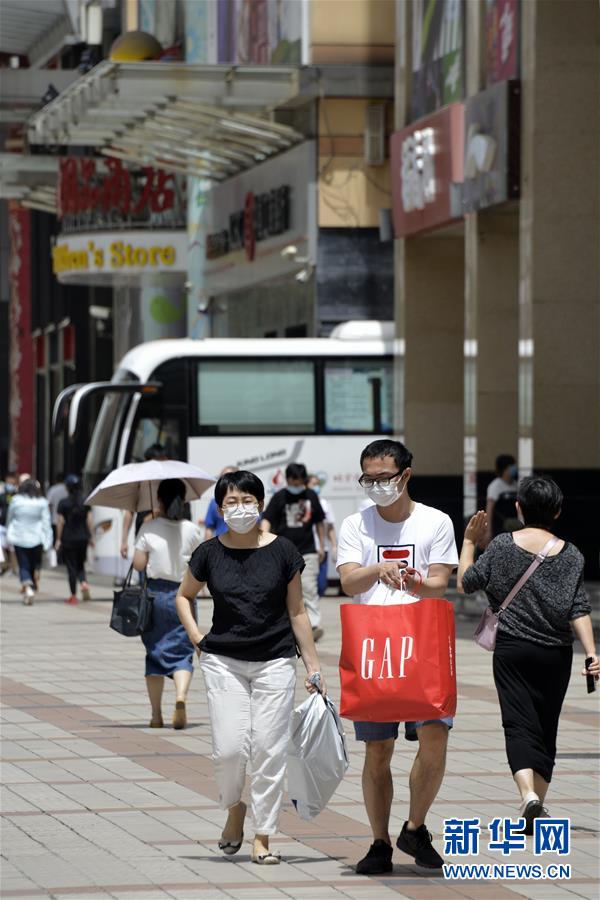 6月3日,市民及游客在王府井步行街觀光。近日,游人和市民紛紛來到北京市的王府井、西單、前門大街等著名商業(yè)街購物休閑,這些老商業(yè)街開始逐步恢復(fù)昔日的繁華。新華社記者李欣攝。