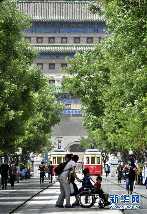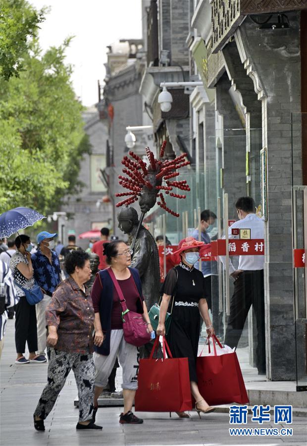 6月3日,市民及游客行走在前門步行街。近日,游人和市民紛紛來到北京市的王府井、西單、前門大街等著名商業(yè)街購物休閑,這些老商業(yè)街開始逐步恢復(fù)昔日的繁華。新華社記者李欣攝。