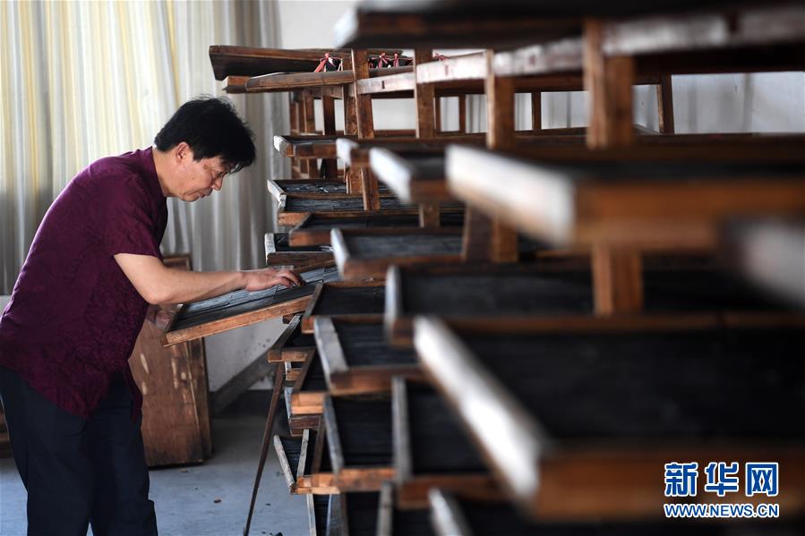 5月20日,安徽省非物質(zhì)文化遺產(chǎn)徽墨代表性傳承人項德勝在查看通風(fēng)晾制的墨。新華社記者劉軍喜攝。