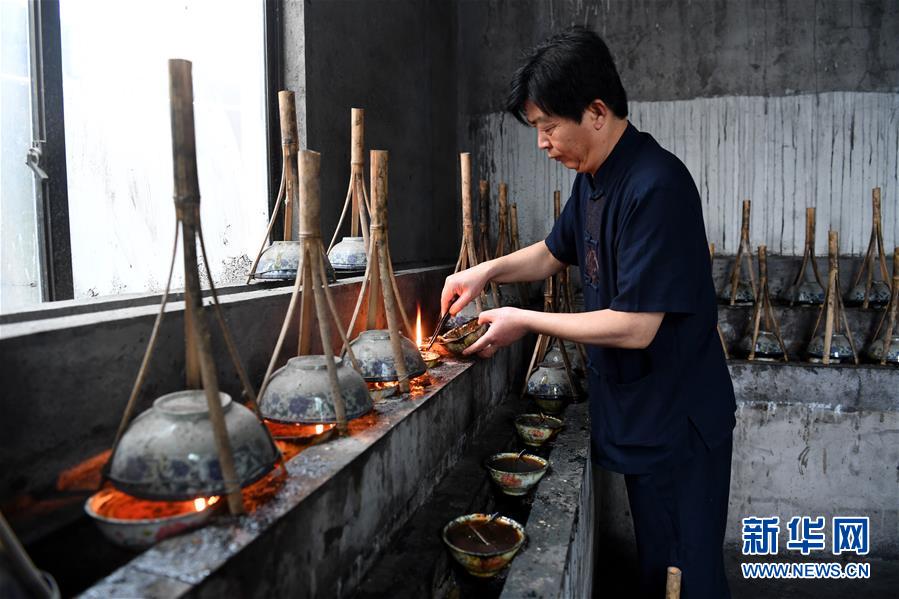 5月21日,安徽省非物質文化遺產徽墨代表性傳承人項德勝在進行古法煉煙。傳統(tǒng)徽墨制作工藝中,第一道工序就是煉煙。這一過程收集來的油煙是徽墨制作中最為重要的原材料。新華社記者張端攝。