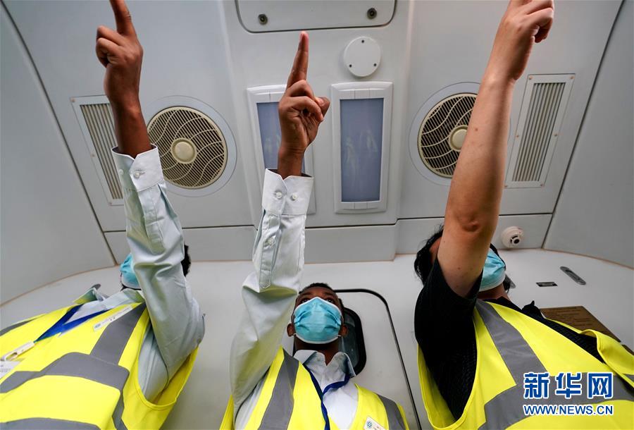 6月5日,實習指導教師帶領伊迪內(nèi)卡邱(中)和特瑞薩(左)練習標準化一次乘務作業(yè)。 新華社記者 李安 攝