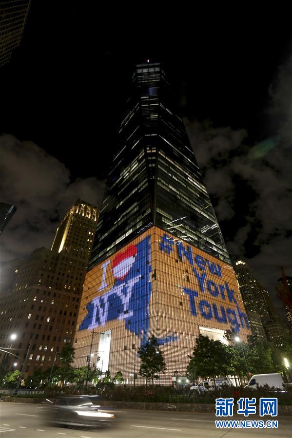 6月7日,美國紐約世貿(mào)中心一號樓外墻呈現(xiàn)出“我愛紐約”和“紐約堅強(qiáng)”字樣。新華社記者王迎攝