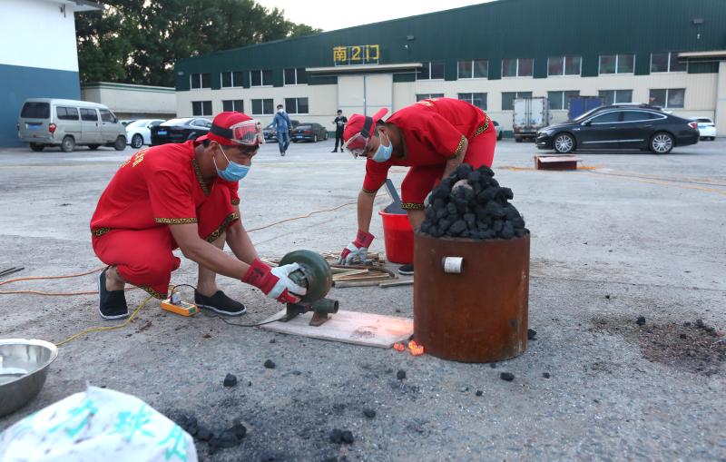 2020年6月7日晚8時(shí)許,吉林長春青岡立交橋附近,演出前,準(zhǔn)備一座熔化鐵汁的熔爐,用大風(fēng)匣鼓風(fēng),把事先準(zhǔn)備好的生鐵化成鐵汁待用。打鐵花用的鐵水需要加熱到1700℃,即看到鐵水迸出金花才行。打鐵花雖然好看,但表演卻極具危險(xiǎn)性,隊(duì)員經(jīng)常被燙傷。表演隊(duì)隊(duì)長朱震介紹說。