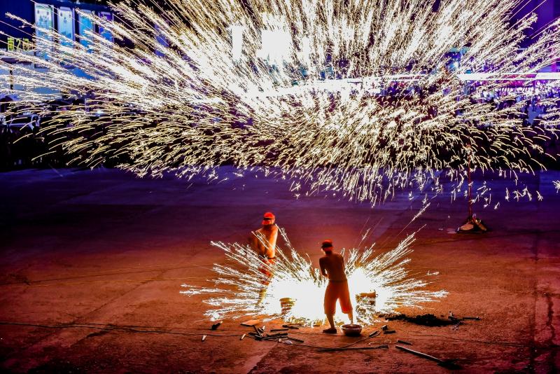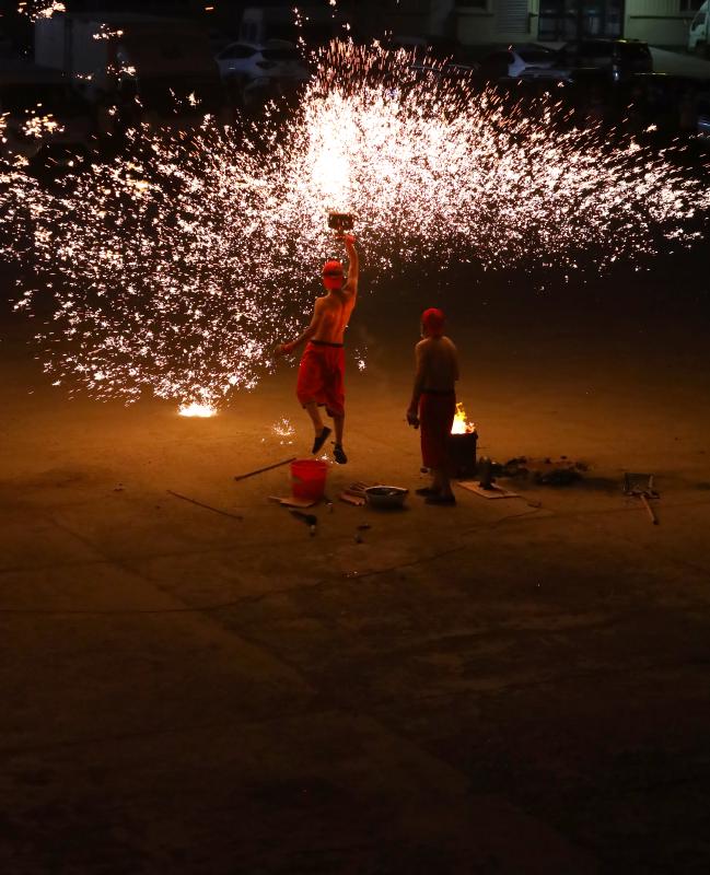 2020年6月7日晚8時(shí)許,吉林長春青岡立交橋附近,神韻打鐵花表演隊(duì)改進(jìn)了傳統(tǒng)單一的擊打鐵花的形式,增添了空中轉(zhuǎn)花、高空散花、鋪地印花等多種花型。一柱鐵花沖天,在空中盤旋,朵朵銀花綻放給觀眾帶來了震撼的視覺享受。