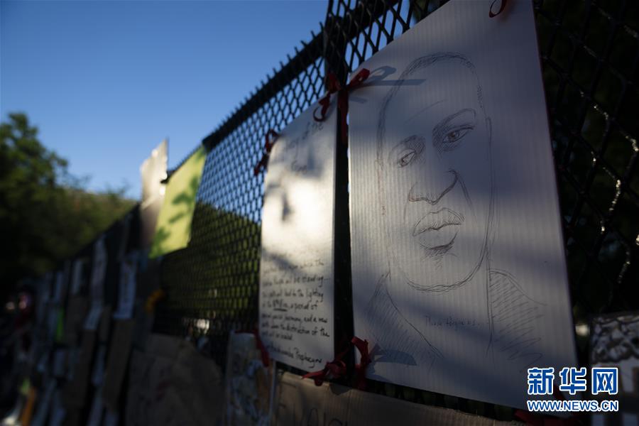 6月8日,美國(guó)華盛頓白宮附近的隔離圍欄上貼著喬治·弗洛伊德的畫像。新華社記者劉杰攝