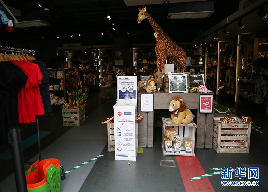 6月9日,法國巴黎動物園的紀念品商店入口處為游客提供消毒免洗洗手液,并在地上標注了參觀方向。受新冠疫情影響關(guān)閉了近3個月的巴黎動物園于8日重新開放。新華社記者高靜攝