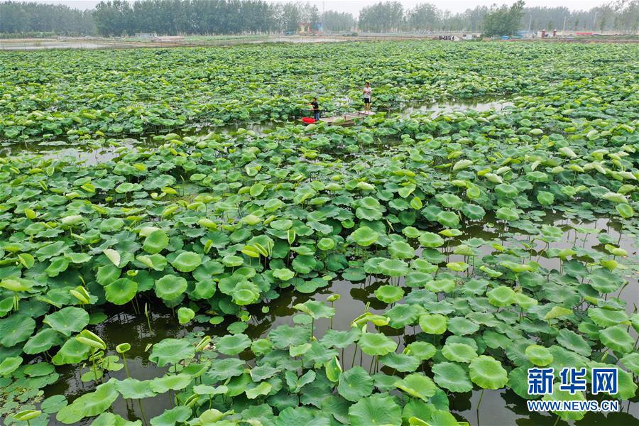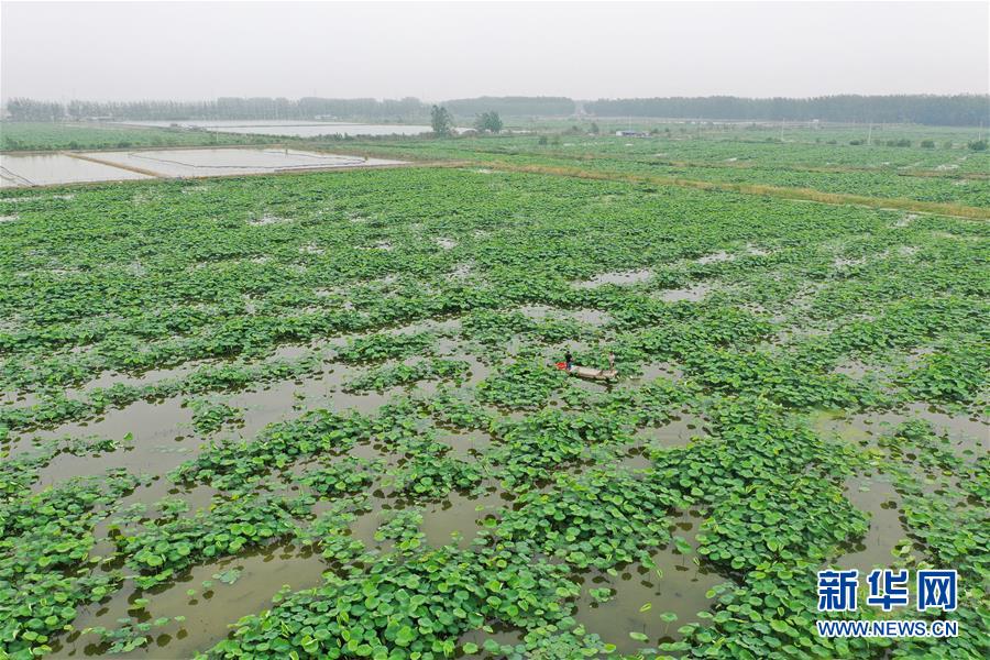6月9日,在宿遷市宿城區(qū)中揚鎮(zhèn)一家淺水藕套養(yǎng)小龍蝦合作社,負(fù)責(zé)人王乃國在取蝦苗(無人機(jī)照片)。新華社記者季春鵬攝