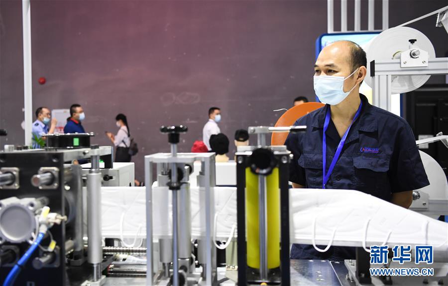 6月10日,參展工作人員站在一臺(tái)KN95口罩生產(chǎn)設(shè)備旁。當(dāng)日,廣州國際防疫物資展覽會(huì)在保利世貿(mào)博覽館舉行。本次展會(huì)面積共計(jì)3.6萬平方米,設(shè)有防疫產(chǎn)品、設(shè)備、綜合服務(wù)、原輔料等4個(gè)展區(qū),參展企業(yè)約600家。新華社記者鄧華攝