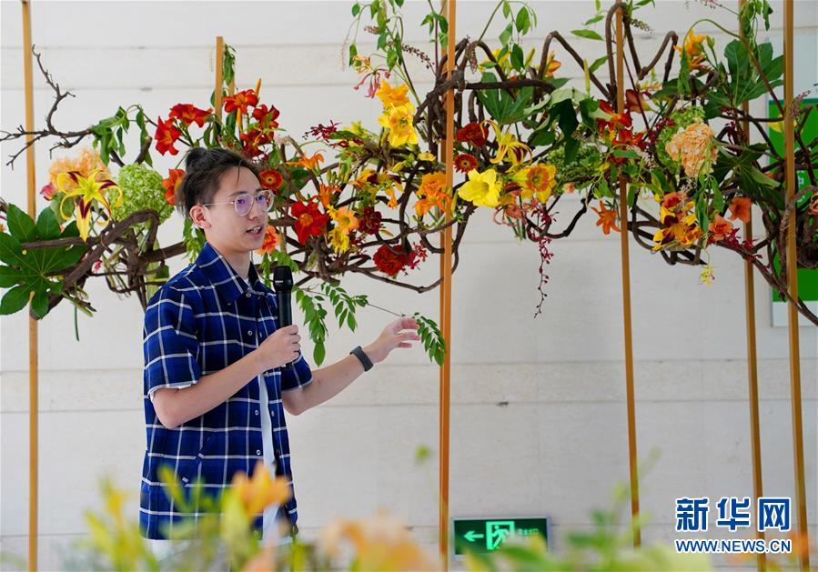 6月13日,第45屆世界技能大賽花藝項目冠軍、上海應(yīng)用技術(shù)大學(xué)學(xué)生陸亦煒在介紹自己主持設(shè)計和創(chuàng)作的花藝作品。當日,“2020中國(上海)萱草文化節(jié)”在上海應(yīng)用技術(shù)大學(xué)開幕,校園里數(shù)百個品種的萱草花競相綻放,萱草科研推廣、萱草文化交流等多項活動同時舉行。新華社記者 劉穎 攝