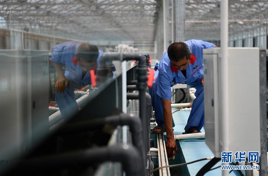 在天津現(xiàn)代晨輝科技集團有限公司的養(yǎng)殖示范場,工人在調(diào)試設(shè)備(6月15日攝)。新華社記者 李然 攝