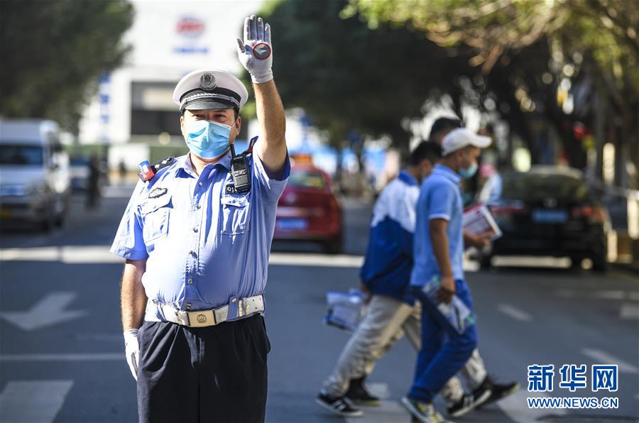 6月20日,在烏魯木齊市第二中學門前,烏魯木齊市公安局交警支隊天山區(qū)大隊新華路中隊警官艾力夏提·哈力木然提在指揮交通。當日,烏魯木齊市初中升高中考試開始。為保障為期三天的中考順利進行,烏魯木齊市公安局交警支隊在各考點執(zhí)勤,為考生保駕護航新華社記者 王菲 攝