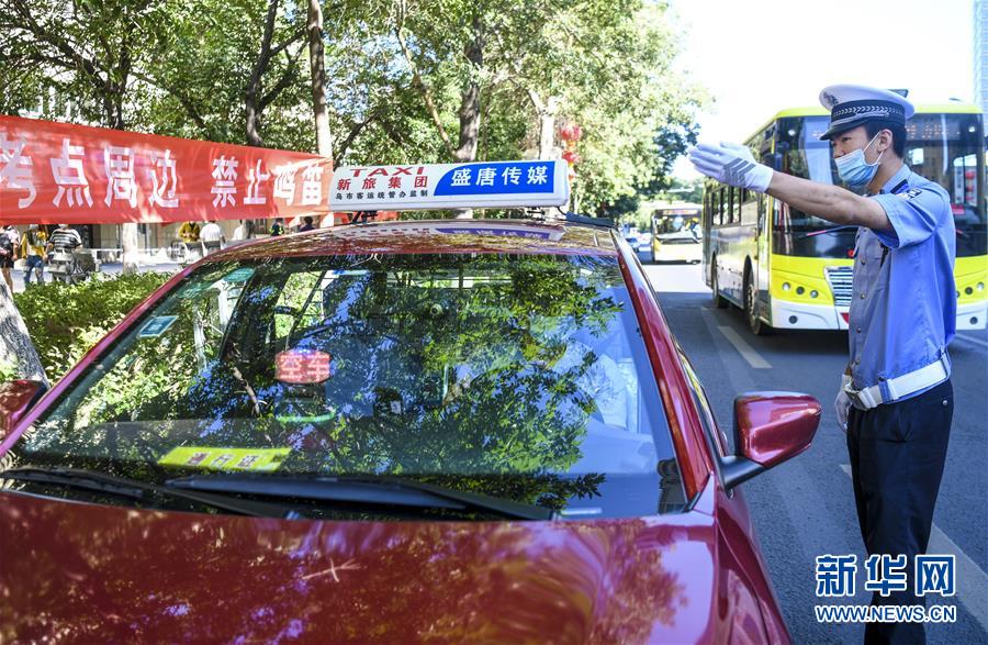 6月20日,在烏魯木齊市第十一中學(xué)門前,烏魯木齊市公安局交警支隊(duì)天山區(qū)大隊(duì)新華路中隊(duì)警官肖健波提醒過(guò)往車輛減速慢行、禁止鳴笛。當(dāng)日,烏魯木齊市初中升高中考試開始。為保障為期三天的中考順利進(jìn)行,烏魯木齊市公安局交警支隊(duì)在各考點(diǎn)執(zhí)勤,為考生保駕護(hù)航新華社記者 王菲 攝