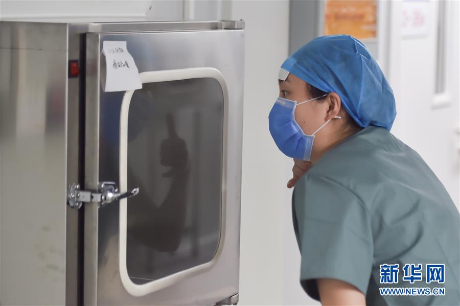 6月19日,在北京地壇醫(yī)院隔離病房外,護(hù)士和病人溝通,做著打電話(huà)的手勢(shì)。新華社記者彭子洋攝