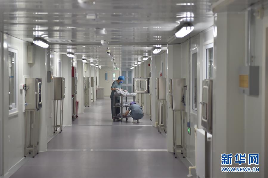 6月19日,在北京地壇醫(yī)院隔離病房外,工作人員在做走廊的清潔。新華社記者彭子洋攝