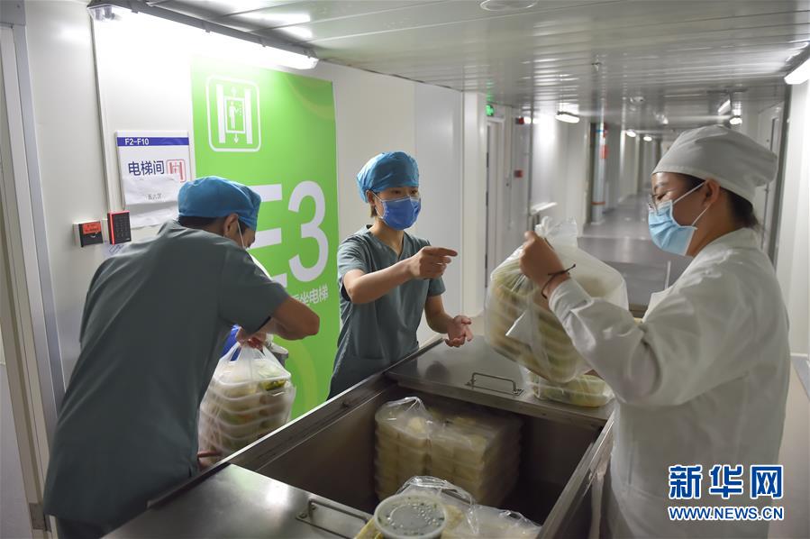 6月19日,在北京地壇醫(yī)院隔離病區(qū)外,護(hù)士為病人取餐。新華社記者彭子洋攝