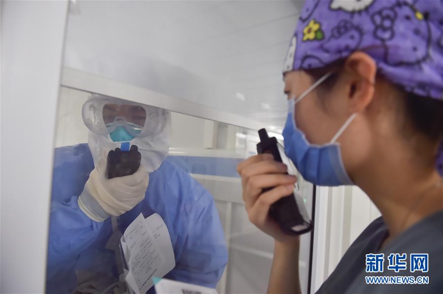 6月19日,在北京地壇醫(yī)院隔離病房?jī)?nèi),護(hù)士正在用對(duì)講機(jī)和外面交流。新華社記者彭子洋攝
