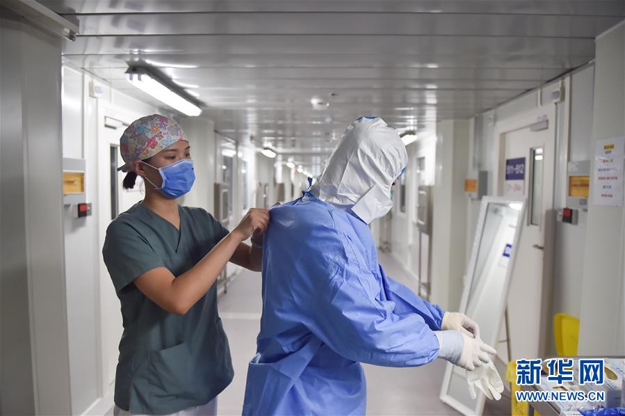 6月19日,在北京地壇醫(yī)院隔離病房外,兩位護(hù)士在幫同事穿防護(hù)服。新華社記者彭子洋攝