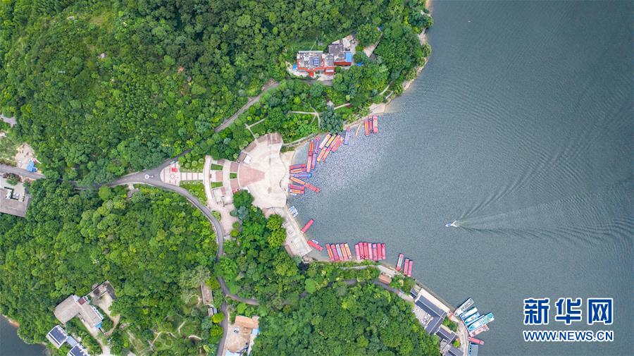 6月21日,游客乘船在紅楓湖景區(qū)游覽(無人機(jī)照片)。夏至?xí)r節(jié),貴州省清鎮(zhèn)市紅楓湖景區(qū)草木蒼翠,秀麗的湖光山色吸引不少游客前來游玩。新華社記者陶亮攝