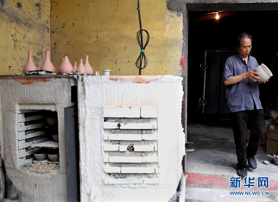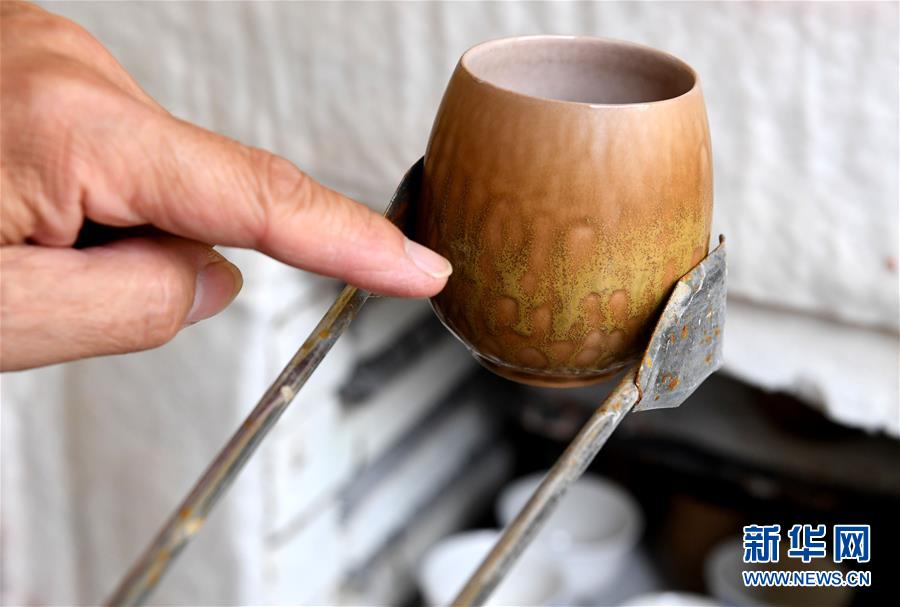 在河南省鞏義市站街鎮(zhèn)小黃冶村的工作室里,游光明運用點彩手法施釉(6月19日攝)。新華社記者李安攝