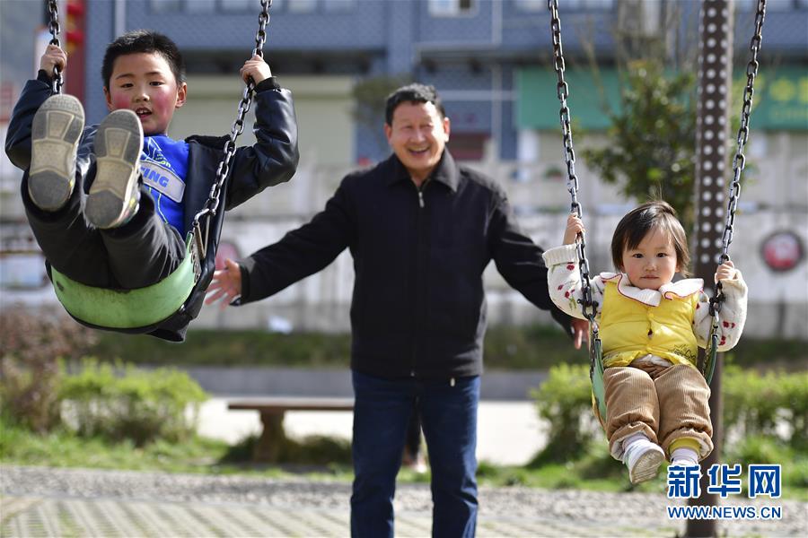 陜西寧強(qiáng)縣大安鎮(zhèn)江林安置點(diǎn)的居民帶著孫子、孫女在安置點(diǎn)廣場(chǎng)上蕩秋千(3月13日攝)。新華社記者邵瑞攝