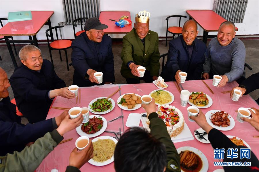 山西省壺關(guān)縣石坡鄉(xiāng)雙井村的“五保戶(hù)”李松興(右三)在石坡鄉(xiāng)養(yǎng)老院過(guò)生日(4月22日攝)。新華社記者曹陽(yáng)攝