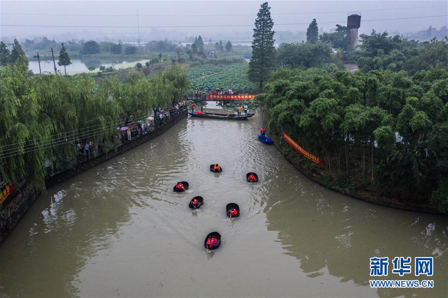 6月23日,東林鎮(zhèn)村民在泉心村荷花池參加端午劃菱桶趣味活動(無人機(jī)照片)。當(dāng)日,浙江省湖州市東林鎮(zhèn)在泉心村荷花池舉辦“慶端午劃菱桶”趣味活動。村民們劃著菱桶在水面上你追我趕,同時采收荷花和蓮蓬,呈現(xiàn)出水鄉(xiāng)特有的端午節(jié)日氛圍。在河網(wǎng)密布的東林鎮(zhèn),菱桶是水鄉(xiāng)家家戶戶都有的一種傳統(tǒng)水上勞動工具,村民在捕魚、采菱、采荷時都要用到。新華社記者徐昱攝