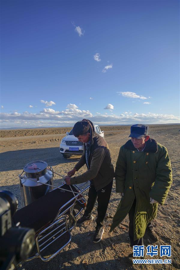在吉木乃縣萬(wàn)駝園內(nèi),牧民米拉木別克·阿依提克(右)在兒子的幫助下準(zhǔn)備騎著摩托車(chē)去交駝奶(6月21日攝)。新華社記者趙戈攝