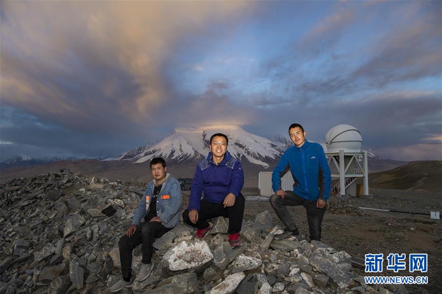 在中國科學(xué)院新疆天文臺(tái)慕士塔格觀測站,天文科技工作者馮國杰(中)、助理觀測員努爾蘭·卡納皮亞(左)、阿克力·圖拉提在慕士塔格峰下合影(6月15日攝)。