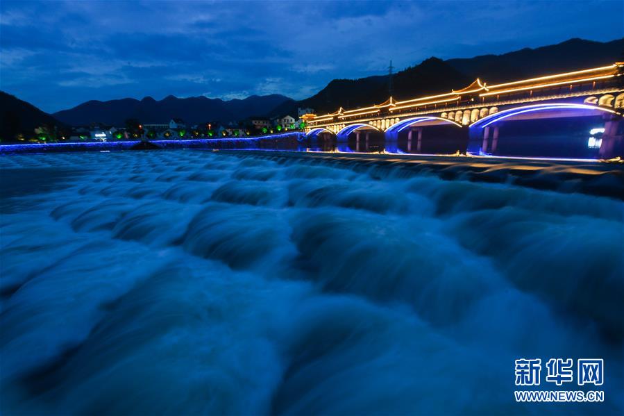 6月27日拍攝的夜色中的杭州市富陽區(qū)湖源鄉(xiāng)龍鱗壩。近期,浙江省杭州市富陽區(qū)場口鎮(zhèn)、常安鎮(zhèn)和湖源鄉(xiāng)組團開啟了一場夏季“綠水青山嘉年華”。這幾個壺源溪流域鄉(xiāng)鎮(zhèn)整合生態(tài)旅游資源,組團開發(fā)山村旅游項目,游客可以參與壺源溪水上游樂、露營永安山頂、特色農(nóng)產(chǎn)品集市和瓜果節(jié)等特色活動。新華社記者徐昱攝