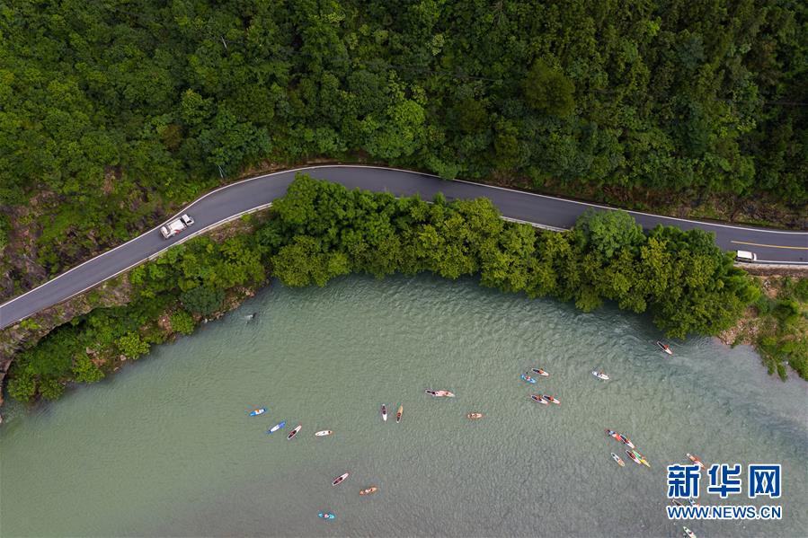 水上運(yùn)動(dòng)愛好者在杭州市富陽區(qū)湖源鄉(xiāng)的壺源溪上體驗(yàn)槳板運(yùn)動(dòng)的樂趣(6月28日攝,無人機(jī)照片)。近期,浙江省杭州市富陽區(qū)場(chǎng)口鎮(zhèn)、常安鎮(zhèn)和湖源鄉(xiāng)組團(tuán)開啟了一場(chǎng)夏季“綠水青山嘉年華”。這幾個(gè)壺源溪流域鄉(xiāng)鎮(zhèn)整合生態(tài)旅游資源,組團(tuán)開發(fā)山村旅游項(xiàng)目,游客可以參與壺源溪水上游樂、露營永安山頂、特色農(nóng)產(chǎn)品集市和瓜果節(jié)等特色活動(dòng)。新華社記者徐昱攝