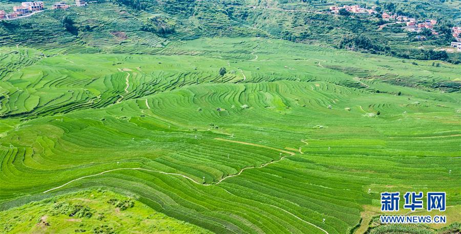 貴州省盤州市新民鎮(zhèn)的梯田風(fēng)光(6月29日攝,無人機照片)。夏日時節(jié),貴州省盤州市新民鎮(zhèn)的梯田風(fēng)景如畫。新華社記者陶亮攝