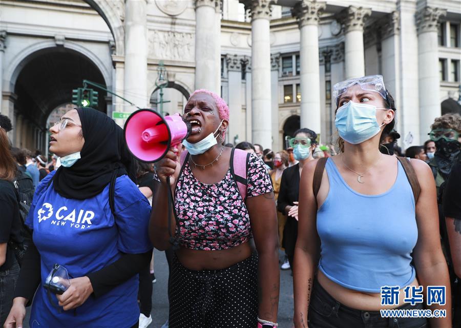 6月30日,人們在美國紐約市政廳附近參加抗議活動。由美國明尼蘇達州明尼阿波利斯市非裔男子弗洛伊德遭白人警察暴力執(zhí)法而死一事引發(fā)的各種抗議活動仍在紐約持續(xù)進行。新華社記者王迎攝