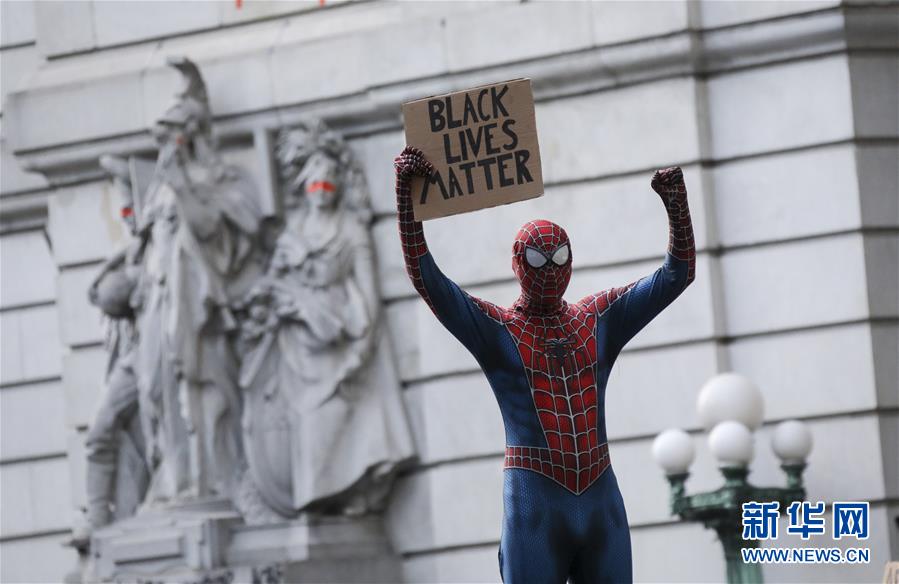 6月30日,一名打扮成“蜘蛛俠”的抗議者在美國紐約市政廳附近手舉寫有“黑人的命也是命”的標語。由美國明尼蘇達州明尼阿波利斯市非裔男子弗洛伊德遭白人警察暴力執(zhí)法而死一事引發(fā)的各種抗議活動仍在紐約持續(xù)進行。新華社記者王迎攝