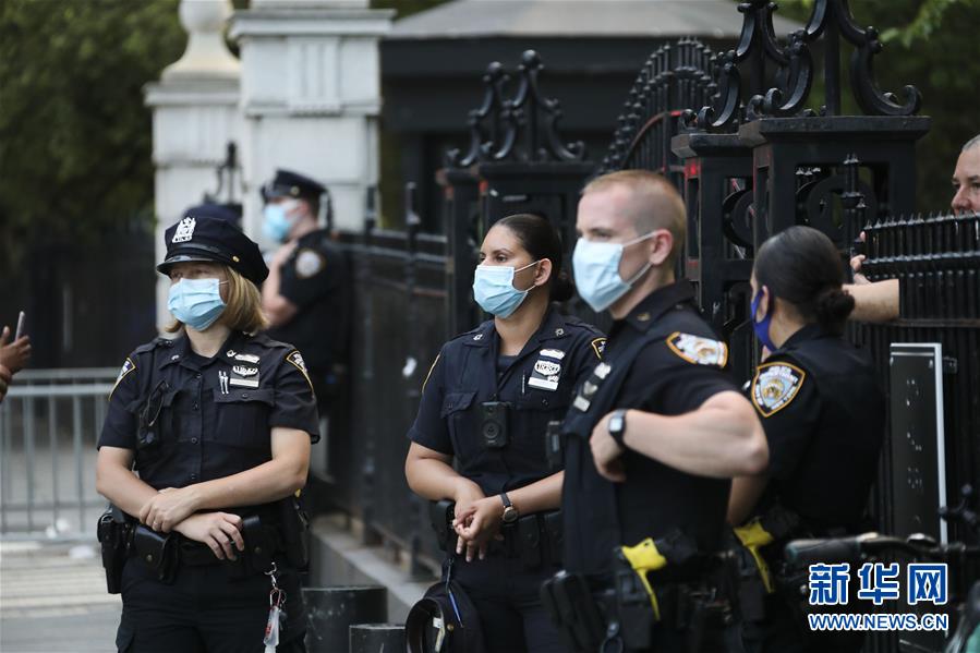 6月30日,警察在美國紐約市政廳附近執(zhí)勤。由美國明尼蘇達州明尼阿波利斯市非裔男子弗洛伊德遭白人警察暴力執(zhí)法而死一事引發(fā)的各種抗議活動仍在紐約持續(xù)進行。新華社記者王迎攝