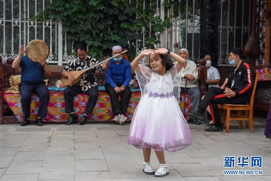 在烏魯木齊大巴扎景區(qū),小朋友跟著音樂起舞(7月4日攝)。夏日周末,烏魯木齊市大巴扎景區(qū)內(nèi)熙熙攘攘,人們來到這里品嘗美食、休閑購物。2018年,經(jīng)過靚化改造后的大巴扎景區(qū)新增長(zhǎng)約800米的步行街,分為文創(chuàng)文旅和“非遺”項(xiàng)目街區(qū)、國(guó)際時(shí)尚街區(qū)和大巴扎美食街區(qū),是烏魯木齊最受歡迎的旅游目的地之一。新華社記者丁磊攝