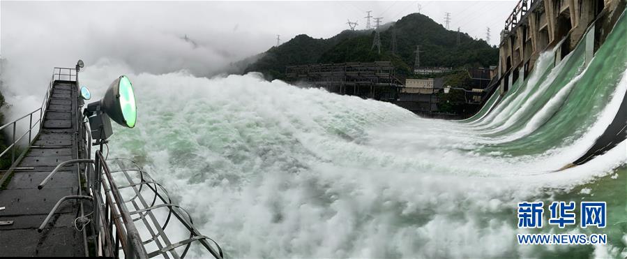 7月7日下午開啟7孔泄洪的新安江水庫(手機(jī)全景模式拍攝)。受持續(xù)降水影響,浙江新安江水庫水位持續(xù)快速上升。繼當(dāng)日10時開啟3孔、12時開啟5孔泄洪后,新安江水庫于16時增加到7孔泄洪。新安江水庫是華東地區(qū)最大的水庫,在錢塘江流域的防洪度汛中起到關(guān)鍵作用。新華社記者翁忻旸攝