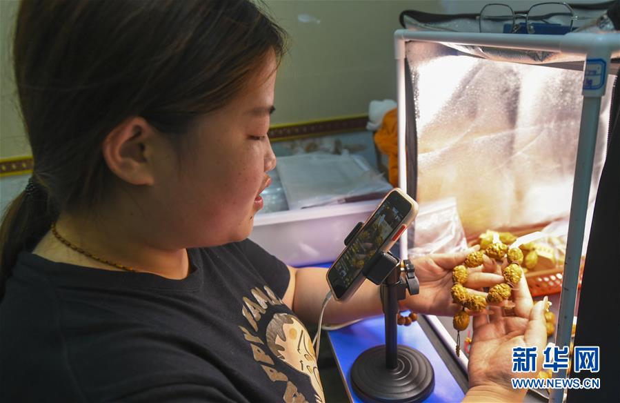 7月7日,河北省永清縣別古莊鎮(zhèn)核雕企業(yè)網(wǎng)絡(luò)主播在網(wǎng)上直播銷售雕刻作品。河北省永清縣有核雕企業(yè)1500余家,相關(guān)從業(yè)人員4萬余人。今年以來,該縣克服疫情影響,廣泛利用電商平臺進行網(wǎng)絡(luò)直播銷售,網(wǎng)上銷售額已占總銷售額的90%以上,有效緩解了線下銷售壓力,為當(dāng)?shù)貛砹己玫慕?jīng)濟效益。新華社記者李曉果攝