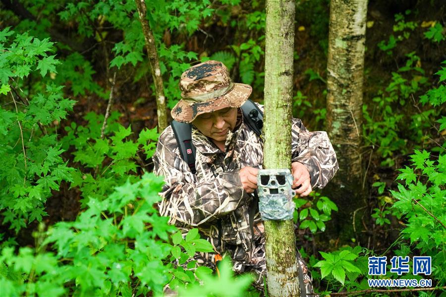 董紅雨在迎春林業(yè)局有限公司施業(yè)區(qū)內(nèi)查看架設(shè)在樹上用于拍攝野生東北虎蹤跡的遠(yuǎn)紅外相機(jī)(7月8日攝)。新華社記者王松攝