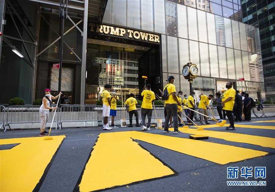 7月9日,在美國紐約第五大道特朗普大廈前,人們涂寫“黑人的命也是命”標語。當天,數(shù)十人在紐約第五大道特朗普大廈前的路面上涂寫“黑人的命也是命”標語。紐約市計劃在多處地點涂寫“黑人的命也是命”標語。新華社記者王迎攝