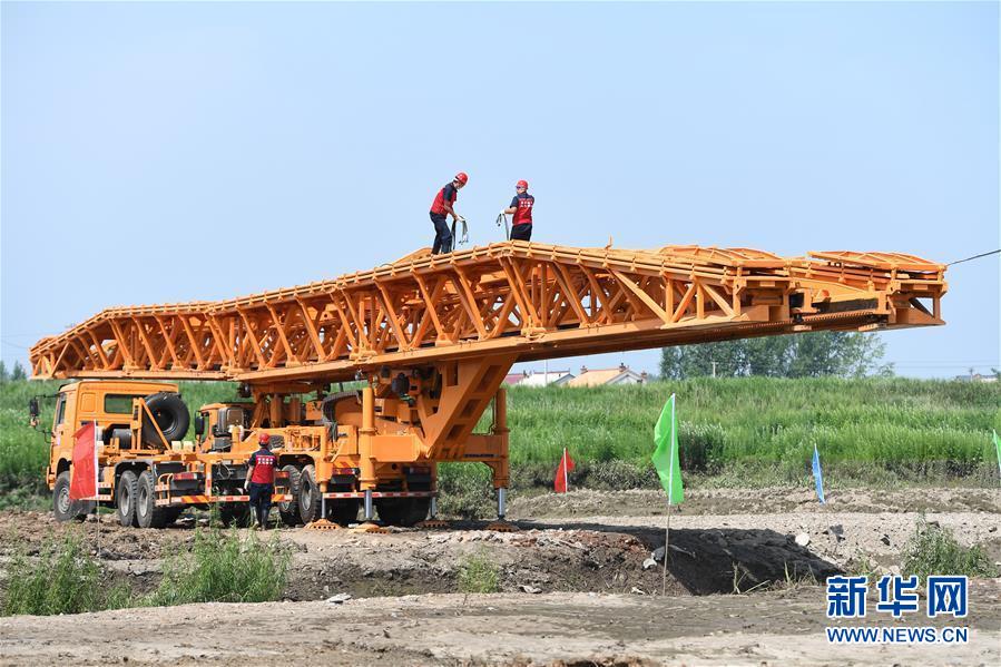 7月10日,工作人員在演練現(xiàn)場搭建機械化橋梁。當(dāng)日,由吉林省交通運輸廳主辦的公路橋梁水毀搶通應(yīng)急演練在長春市雙陽區(qū)雙陽河舉行,參與演練人員從汛情水毀信息報送、應(yīng)急裝備快速集結(jié)、機械化橋梁搶通搭設(shè)、善后處理等方面進(jìn)行實戰(zhàn)演練。新華社記者張楠攝