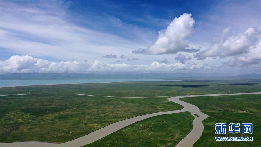 7月10日拍攝的青海湖畔風(fēng)光(無人機(jī)照片)。盛夏時(shí)節(jié),被譽(yù)為“中國最美湖泊”的青海湖畔景色宜人,藍(lán)天、白云、湖水與草原組成一幅壯美的畫卷。新華社記者 張宏祥 攝
