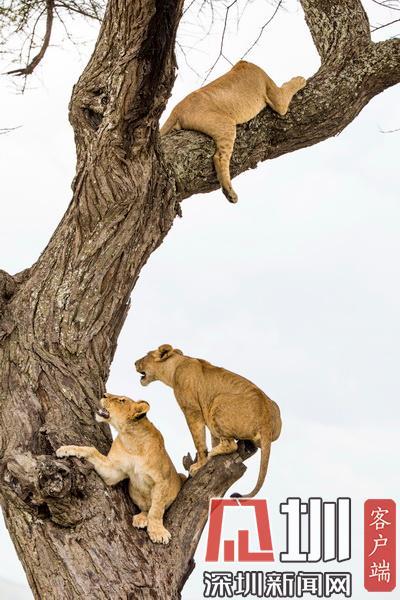 2020年7月13日?qǐng)?bào)道(具體拍攝時(shí)間不詳),Sandesh Kadur是一名印度野生動(dòng)物攝影師,他在坦桑尼亞塞倫蓋蒂?lài)?guó)家公園拍攝到一系列“獅子上樹(shù)”的精彩照片。畫(huà)面中,有一只憤怒的母獅為了捍衛(wèi)自己在樹(shù)上的位置,一邊劈叉一邊對(duì)著鏡頭咆哮,有兩只獅子為了爭(zhēng)奪位置互相攻擊,還有一只獅子在找到舒適的位置后呼呼大睡。